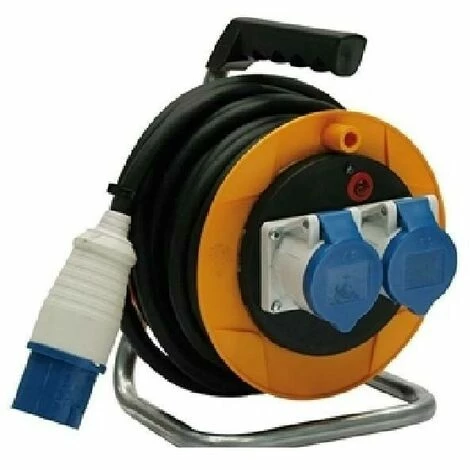 Körper der speziellen Breflex-Kunststofftrommel auf einem Metallträger. Handlich und leicht – viel Kabel auf kleinstem Raum. CEE 3-poliger Stecker 230 V/16 A, 2 CEE 3-polige Steckdosen 230 V/16 A. Mit Überhitzungsschutz.Sektion: 1.5mm