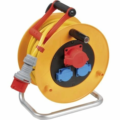 Kabeltrommel mit unzerbrechlicher Tragegriff aus Kunststoff. Bestückung: 1 CEE-Dose 16A 5p 400V, 2 Maschinensteckdosen mit selbstschließenden Klappdeckeln, blau, 16A 250V. Ausführung: Kabelfarbe gelb.