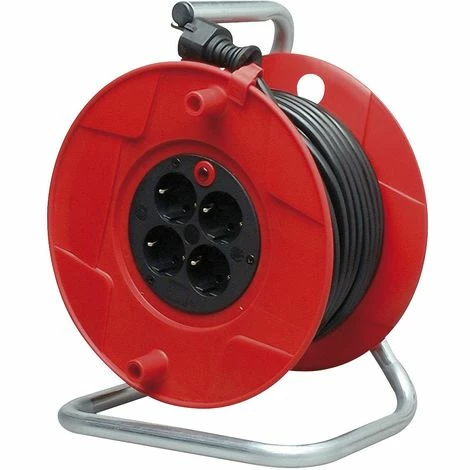Trommelkörper aus Breflex-Spezialkunststoff auf verzinktem Tragegestell, ergonomischer Handgriff mit Achse für perfekte Kabelführung beim Auf- und Abrollen, Überhitzungsschutz, Kontroll-Leuchte bei Überhitzung und Überlastung.
